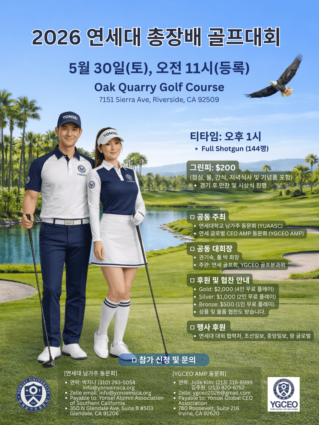 연세대학교 남가주 동문회(YUAASC)와 연세 글로벌 CEO AMP 동문회(YGCEO AMP)가 공동 주최하는 2026 연세대학교 총장배 골프대회가 오는 5월 30일(토), 리버사이드 소재 Oak Quarry Golf Course에서 개최됩니다.