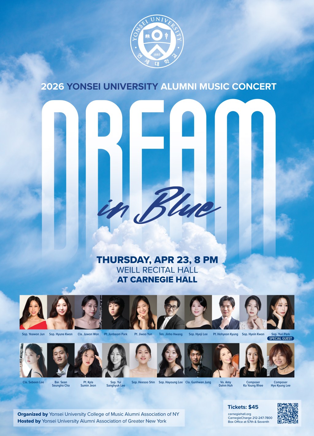 뉴욕의 봄을 더욱 찬연하게 물들일 특별한 예술의 밤, 2026 연세대학교 동문 음악회: Dream in Blue가 카네기 홀 내 Weill Recital Hall에서 개최됩니다. ‘푸른 꿈’이라는 주제 아래 펼쳐질 아름다운 선율에 동문 여러분을 정중히 초대합니다.