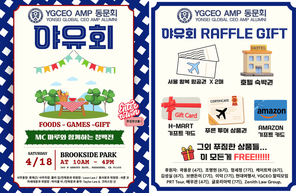 특히 이번 행사는 연세대 남가주 동문회(YUAASC) 동문 여러분을 정식으로 초청하여, 남가주 지역을 대표하는 두 지회가 연세의 이름 아래 하나로 화합하는 뜻깊은 자리가 될 예정입니다. 바쁘신 일상이지만 부디 참석하시어 자리를 빛내주시고, 선후배 간의 따뜻한 정을 나누는 유익한 시간을 가지시길 바랍니다.
